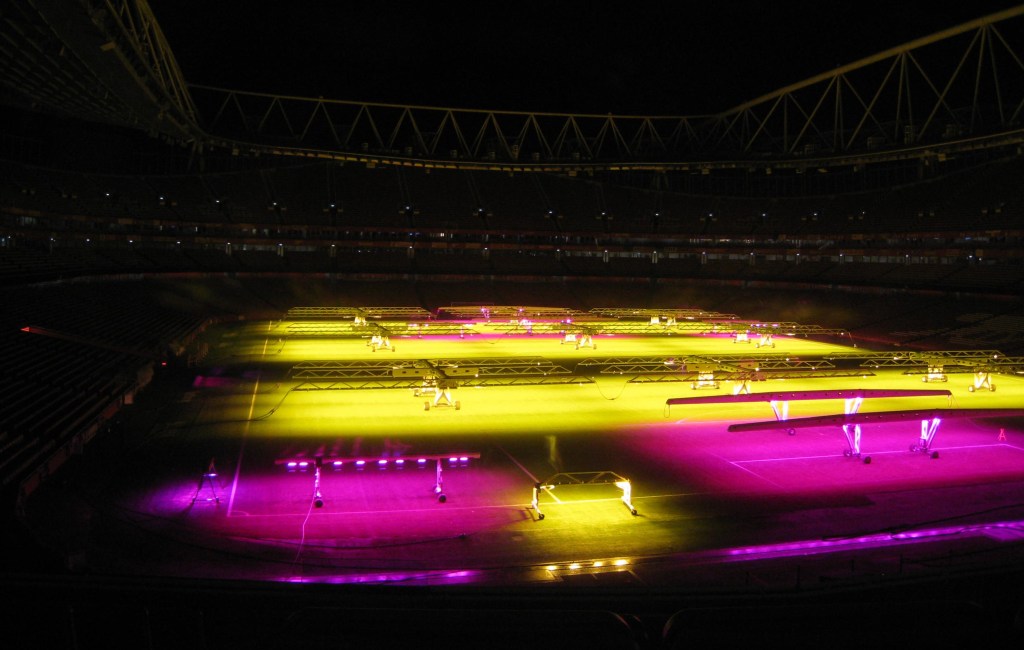 Ascending the escalator to the Dial Square club lounge, the first thing you see is the football pitch, lit up in a luminescent yellow and purple as the artificial growing lights shine down on the surface. Then you turn to see chess board after chess board, after chess board.