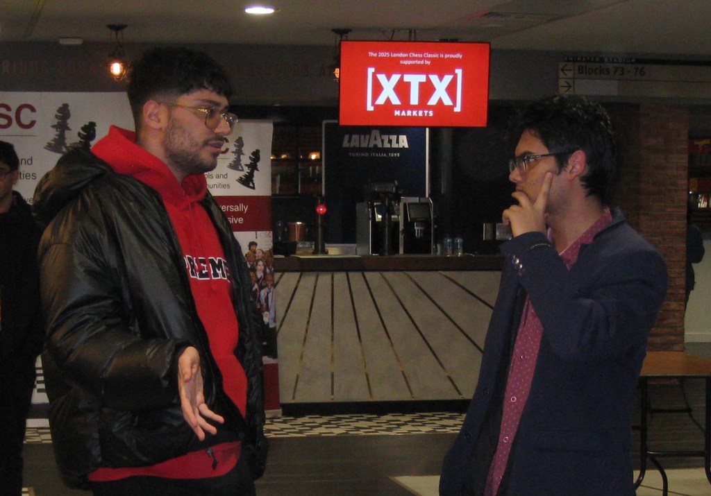Firouzja and Mishra finish their match in a draw, shaking hands over the board. They reassess the game very quickly in quiet discussion before Firouzja grabs his black puffer jacket and heads out the room.